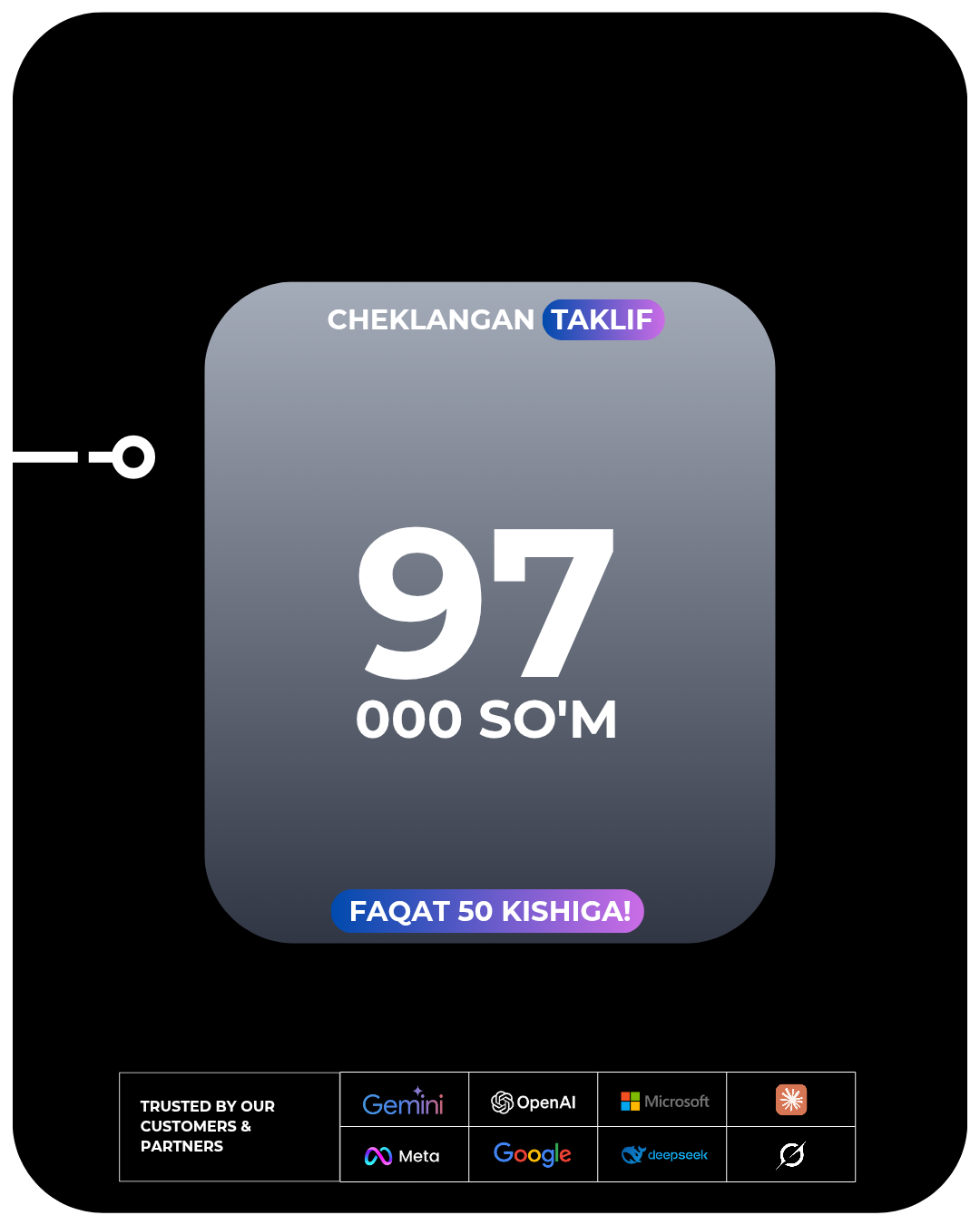 MAVZULAR: AI Copywriting, Mijozlarni jalb qilish, Sotuv hunisi, Til o'rganish, Shaxsiy brend, SEO, SMM strategiya, Onlayn kurs yaratish, Biznes-reja, Frilanserlik va boshqalar.